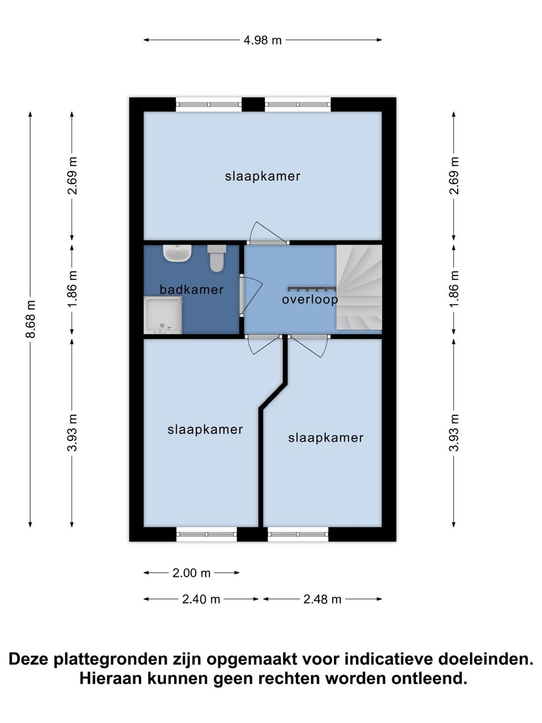 - Eerste verdieping: Overloop en vaste trap naar tweede verdieping. Drie ruime slaapkamers en een badkamer met wastafel, toilet en douche.